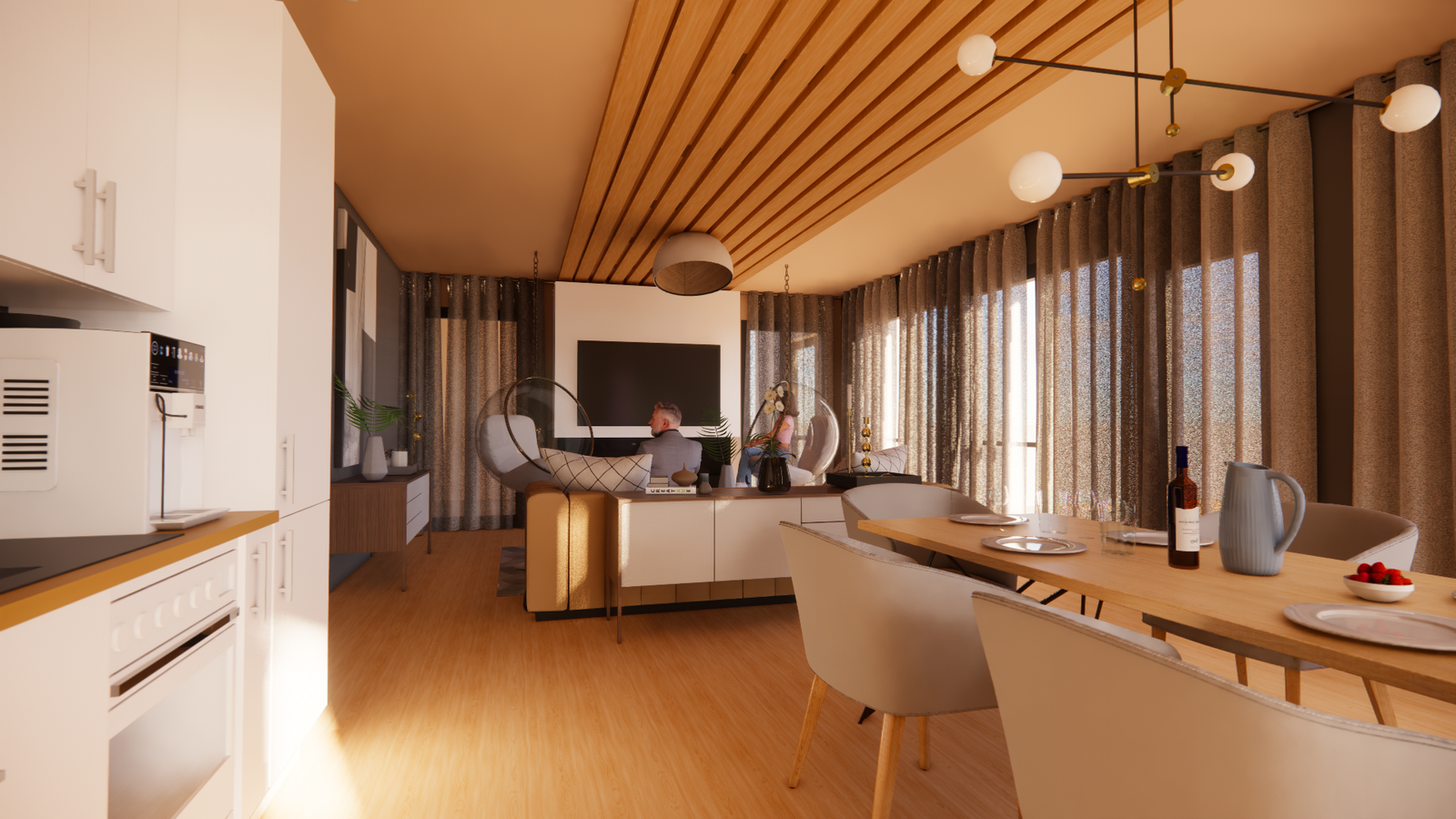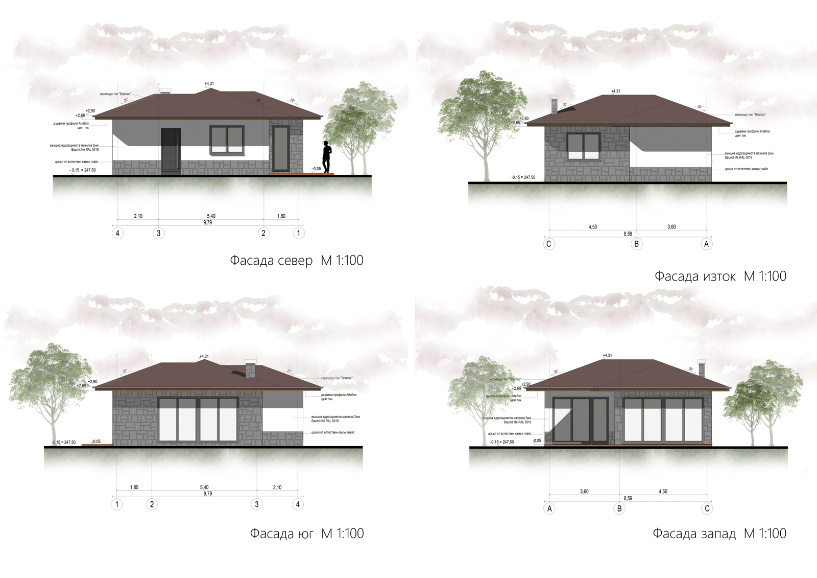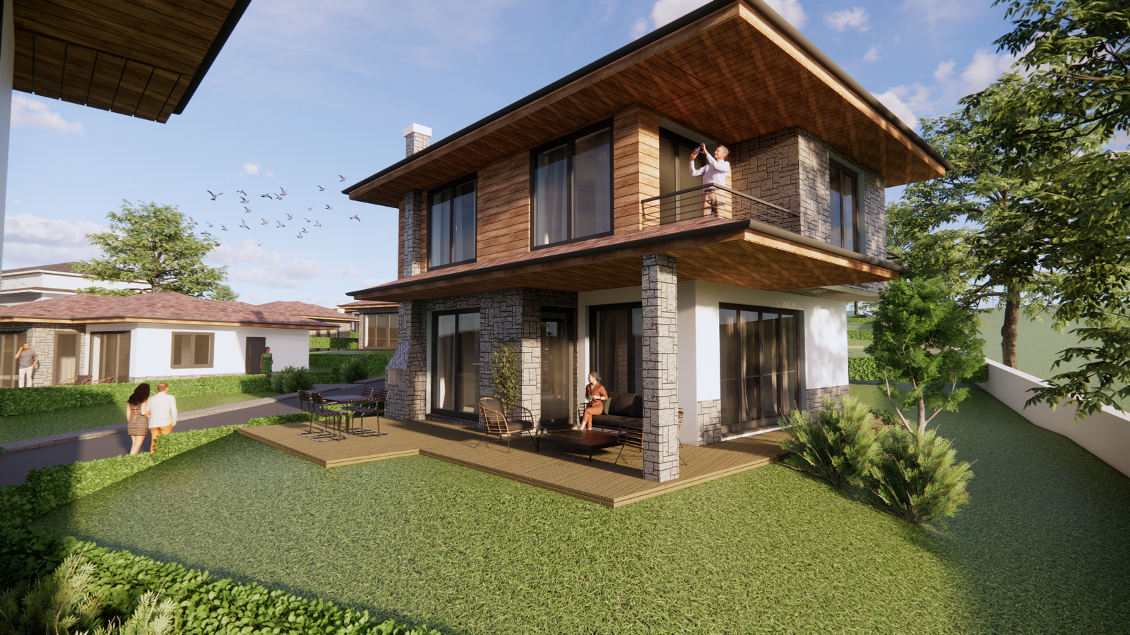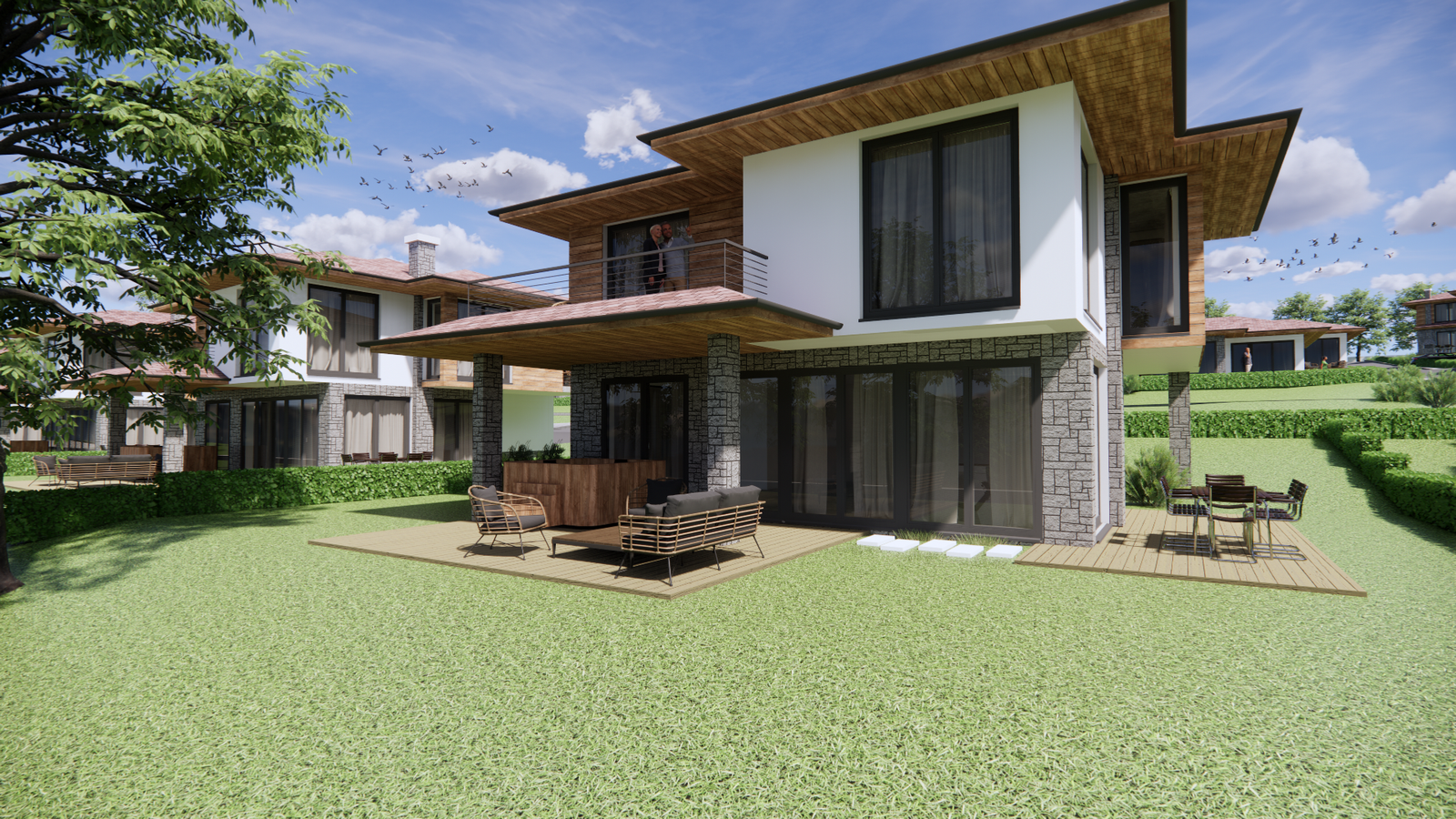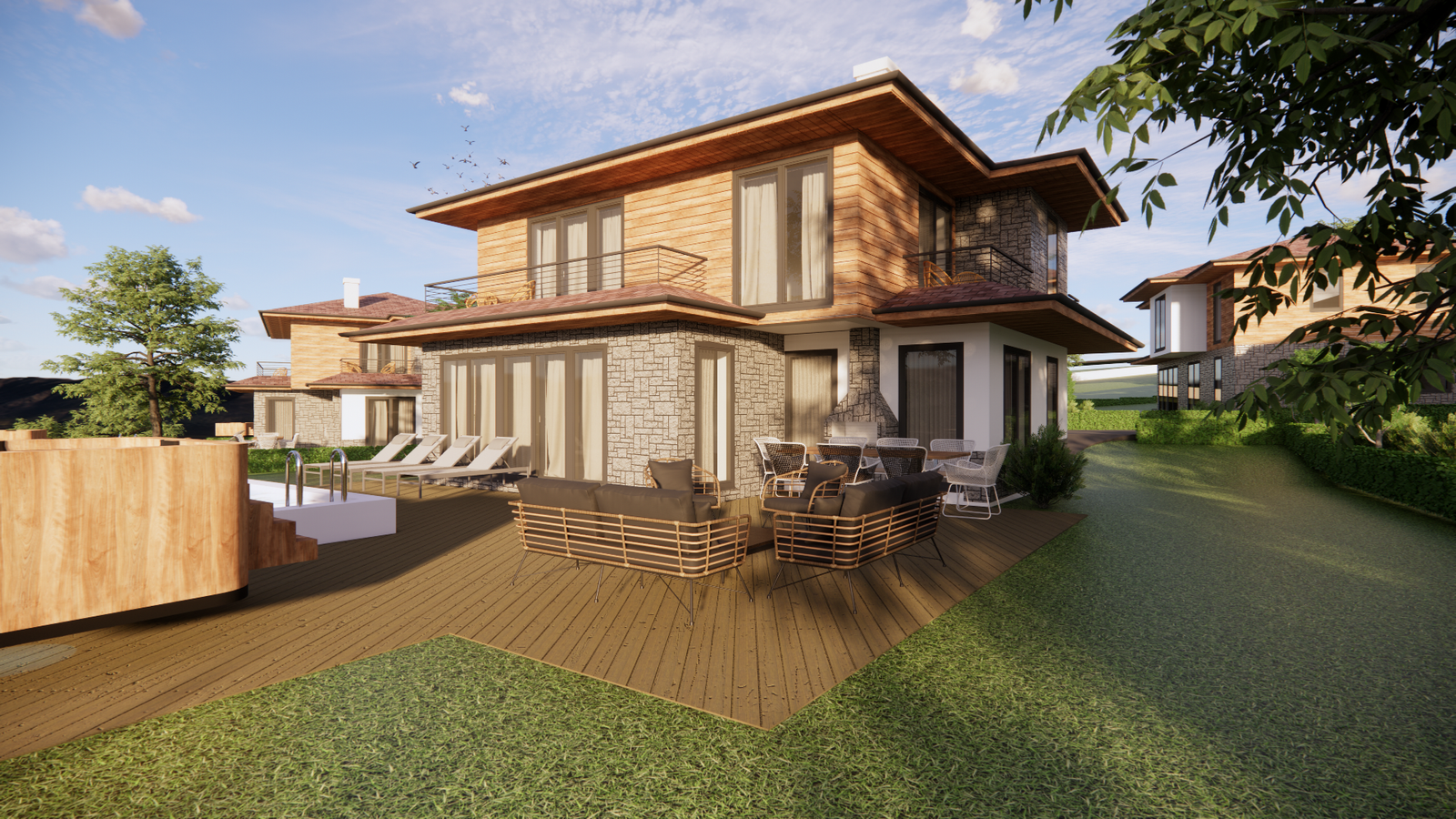 Проект от четири типа еднофамилни къщи с различна площ. Всяка разполага с двор и просторен изглед към язовир Студен кладенец.Ваканционна къща тип А е едноетажна с РЗП от 53кв.м – всекидневна с кухненска част, спалня, баня, склад и веранда. Ваканционна къща тип В е двуетажна с РЗП от 95кв.м и разполага със собсвено паркомясто– всекидневна с кухненска част и камина, две спални със собствени балкони, баня, склад и веранда с барбекю.Ваканционна къща тип C е двуетажна с РЗП от 128кв.м и разполага със собсвено паркомясто – всекидневна с кухненска част и камина, три спални, два балкона, две бани, склад и веранда с барбекю, и джакузи.Ваканционна къща тип D е двуетажна с РЗП от 166кв.м и най-луксозната – всекидневна с кухненска част с остров и камина, склад, четири спални, една със собсвена баня, а останалите с обща, всяка има собсвен балкон, веранда с барбекю, джакузи и басейн.